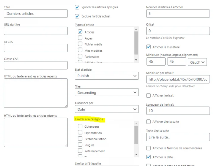 Une fois que vous avez glisser le Widget dans la colonne, on vous proposera diverses options, telles que « Limiter à la catégorie« , qui vous permettras donc de filtrer les derniers articles à une catégorie spécifique ». Mais vous pouvez bien évidemment, exploiter tous les autres filtres à votre guise.