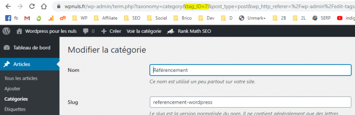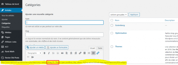 Il s’agit de la même adresse qui s’affiche lors du survol de la souris et lorsque vous éditez la catégorie. Une fois de plus, pour les catégories, c’est le numéro indiqué dans « tag_ID ». Ne cherchez pas « categorie_ID » comme pour les posts et pages, ce paramètre n’existe pas.